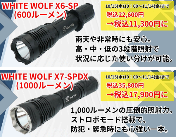 日頃の感謝を込めて、大人気の【WHITE WOLFタクティカルライト】が期間限定・半額でご提供します!